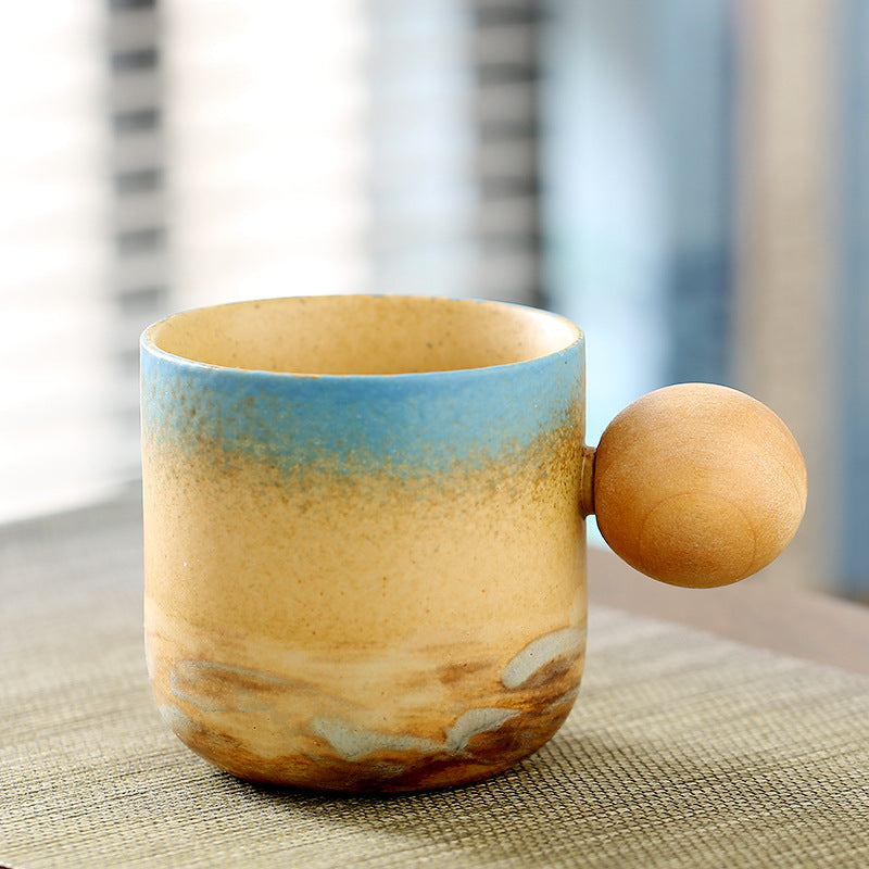 The Solis Cup captures the warmth of morning light in clay. Handcrafted in Dehua, each piece combines smooth ceramic with a polished wooden handle — a modern interpretation of traditional craft. The glaze blends sunlit ochres with soft sky blue, a gentle horizon formed by fire and mineral.